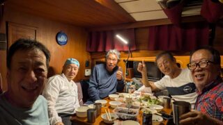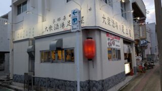 与那原マリーナ近くの大衆酒場足立屋でせんべろ。ビールなど3杯とおつまみで1000円。県産白身刺身580円とアスパラバター500円、てびち(おでん)280円。大満足!せんべろでは止まらず、ボトルキープ、2200円。(税別)