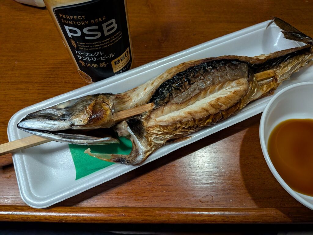 夕食は小浜で買った鯖の丸焼きです。お酒が進みます。