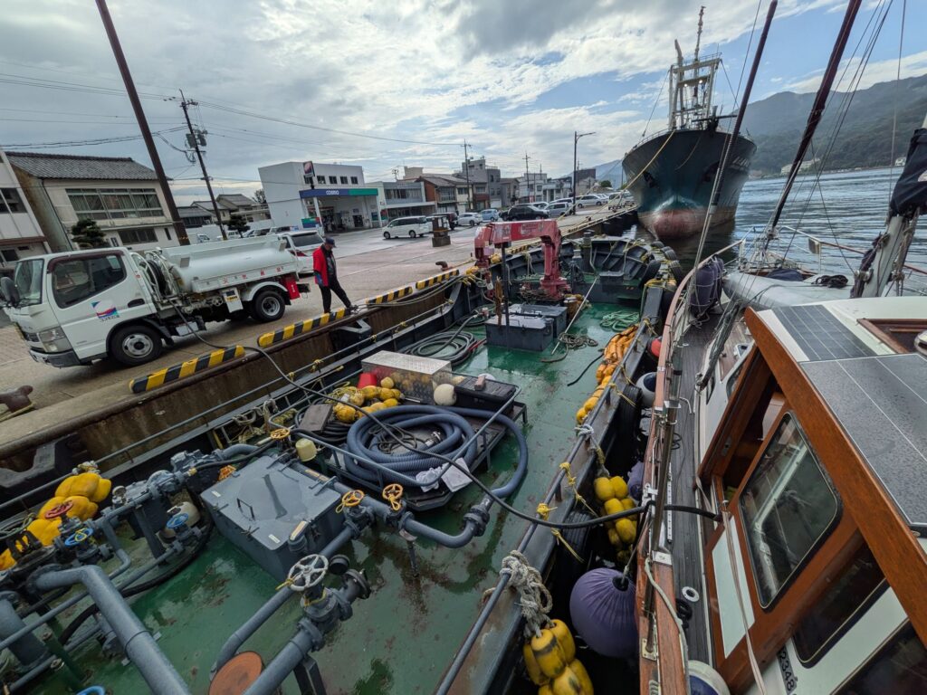 小雨の中、鳥取港を6:15に出航、海岸線に沿って航行して境港公共マリーナに向いました。出航直後は南風10m/sオーバーの追い風でしたか陸近くで波はなく快適、その後は風は落ちたり吹き上がったり小雨が降ったり止んだりてしたが、クォーターリーの風で快適なクルージングができました。マリーナから連絡があり岸壁修理中でマリーナではタンクローリーから給油できないとのことなのでガソリンスタンドに連絡をして境港の水路途中のガソリンスタンド前で給油することになり、行き先を変更。ちょうど風も変わり風速10m/sのクローズホールドになり3時間の厳しい航海となりました。給油後マリーナに向いましたが、5.5海里の遠回りで到着は16:00となりました。給油込みで54海里10時間弱の航海になりました。明日はマリーナでのんびりする予定です。