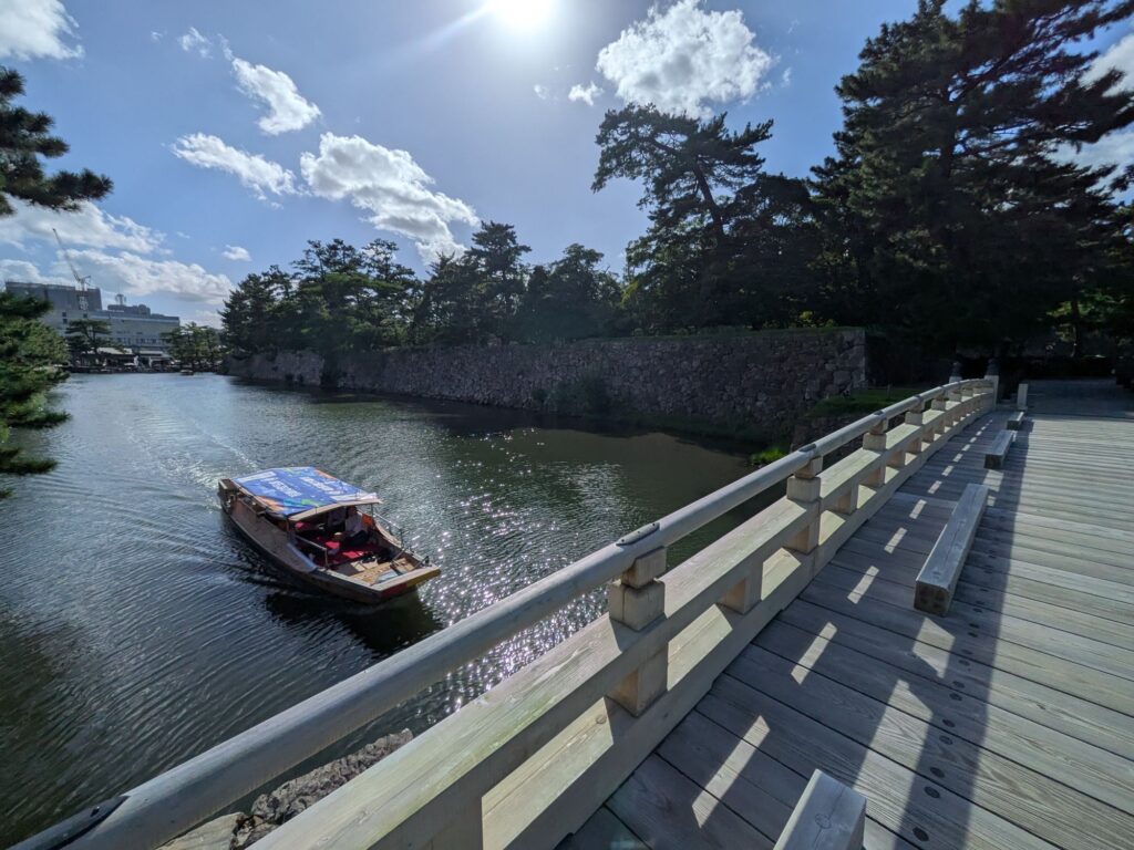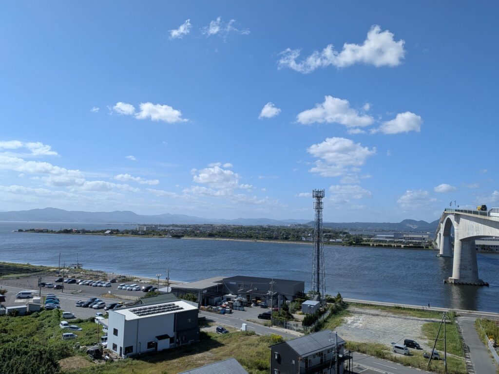 境港公共マリーナ6日目、台風22号の影響であと2日は滞在することになりそうです。昨夜から強風が続いていますが、朝から天気が良いので転車で江島大橋に行きました。橋を越えると島根県の松江市に入り市バスで松江城まで行くことができました。