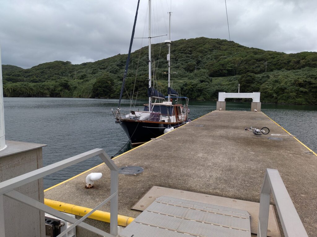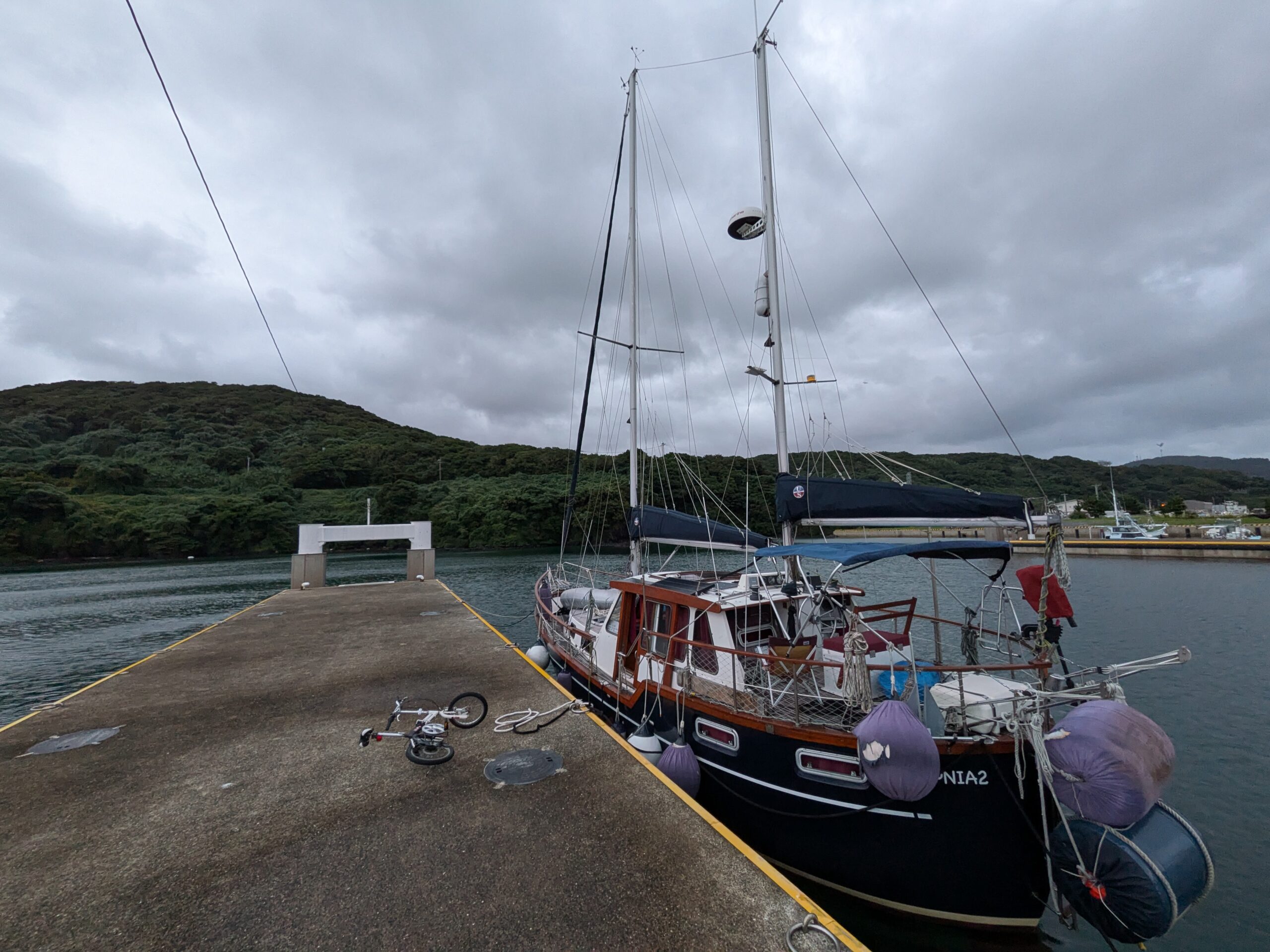 2025/10/19 郷ノ浦港(2) Yacht 2025.10.19 郷ノ浦港2日目です。朝からどんよりした天気。時折ゴーっと風の音がする、一日中霧雨が降ったり止んだり、自転車も活躍できません。幸い泊地はうねりなく静かです。Windyの予測では暫くは風が強く出航できそうにありません。のんびりするしかなさそうです。 風が東にブレてきたので西側に移動しました。これで風が上がっても安心です。浮桟橋を占有できて快適です。