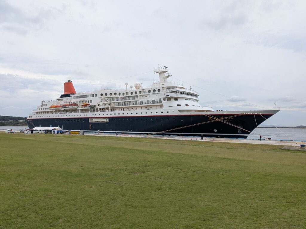 昨日入港の話を聞いて帆船の日本丸と思っていましたが客船の方でした。にっぼん丸は2026年5月10日に引退する予定らしく、お目にかかるのは最後かもしれません。Compania2と同じカラーリングです、エレガンスですね。