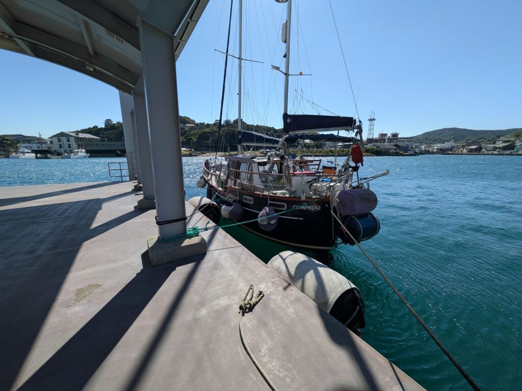 平戸港の中でも風は10m/s超、大きな固定フェンダーが邪魔で着岸に苦労しましたが、地元の方にもやいを取ってもらってなんとかなりました。この浮桟橋に4艇係留できますが1艇分ば緊急用、予約はできません空いていれば係留可能、目の前の観光案内所に届けを出しました。無料でした。風がビュービュー吹いていますが揺れなく静かです。