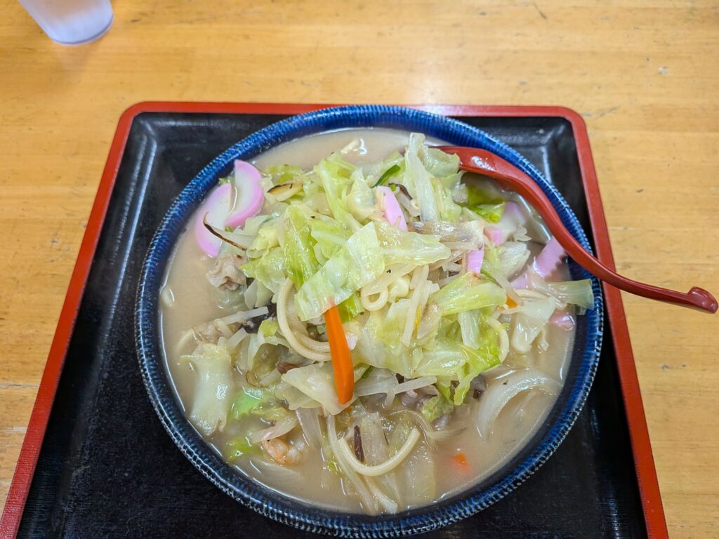 一ふじ食堂。アジフライなど定食もたくさんあり、地元の人で昼前には満席。チャンポン(大)を注文しました。