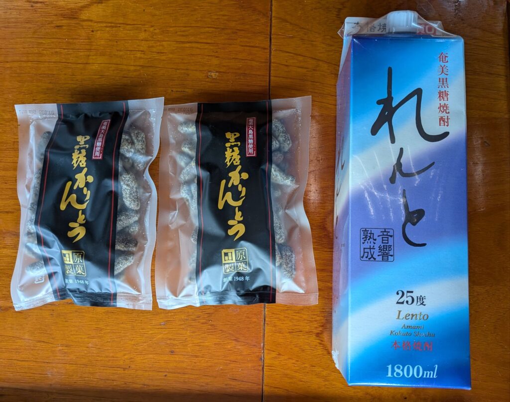 島の名物。黒糖焼酎のれんとと田原製菓の黒糖かりんとう。