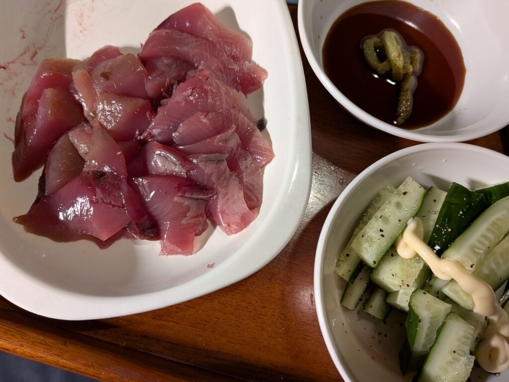 瀬戸内町きゅら島交流館でシャワーが借りられると聞いたので行きました、一室なんで空いていればラッキー、220円。夜は釣ったカツオの刺身です。