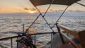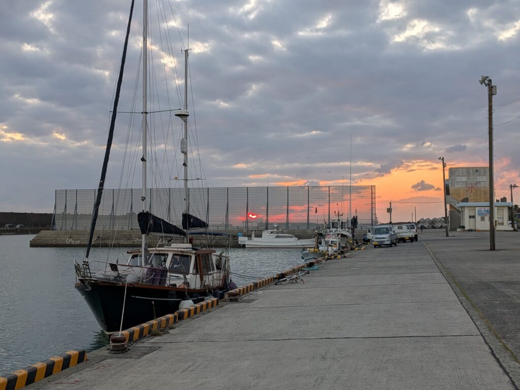 知名漁港の夕日。温泉サウナが近くAコープもありいいところでした。毎日地元の方が軽トラで様子見に来ていただいています。ヨット好きの方が多いようです。台風が直撃すると8mの防波堤越えて波が入り、この岸壁も高潮で水没するとのこと、怖いですね。