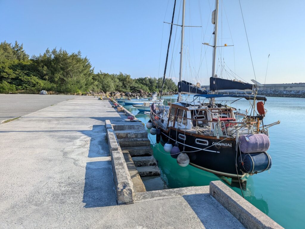 知名漁港を6:30に出航、風は真後ろ5~7m/s、穏やかな天気で心配していたうねりも大きくはなく快適なクルージングでしたが、伊是名島の仲田港に到着すると岸壁にしゅんせつ作業船がいて係留スペースがない。伊是名漁港に変更し岬を一回りして14:00到着。43海里、7時間半の航海でした。ヨットで沖縄初上陸。明日はいよいよ沖縄本島の宜野湾港マリーナに向かいます。