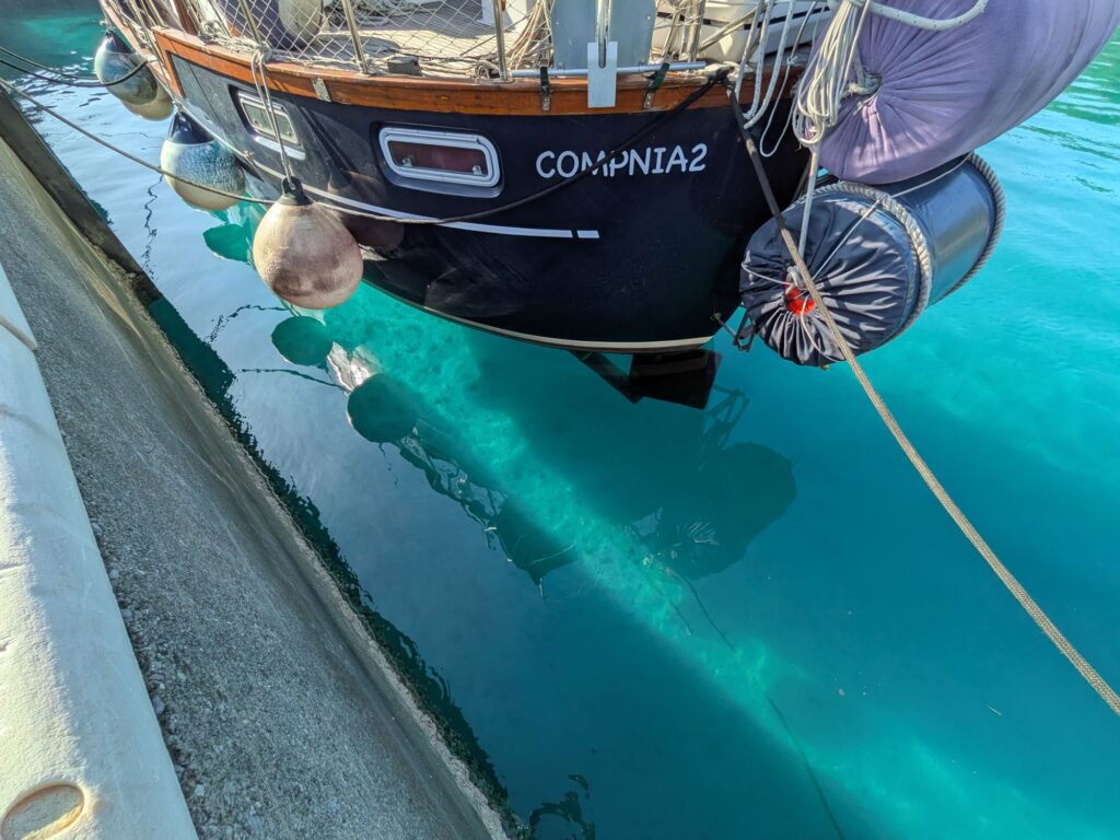 港の一番東側の区画に係留、街から離れているので静かです。透明度が凄いので潜って船底とプロペラをチェック、船底にフジツボが数個ついていただけでした。