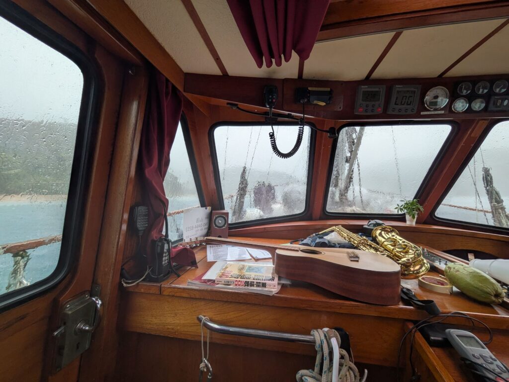 風でヨットが傾き左右に振り回されましたが、そんな中でサックスとギターの練習をしていました。楽器が暇つぶしにはちょうどいい。