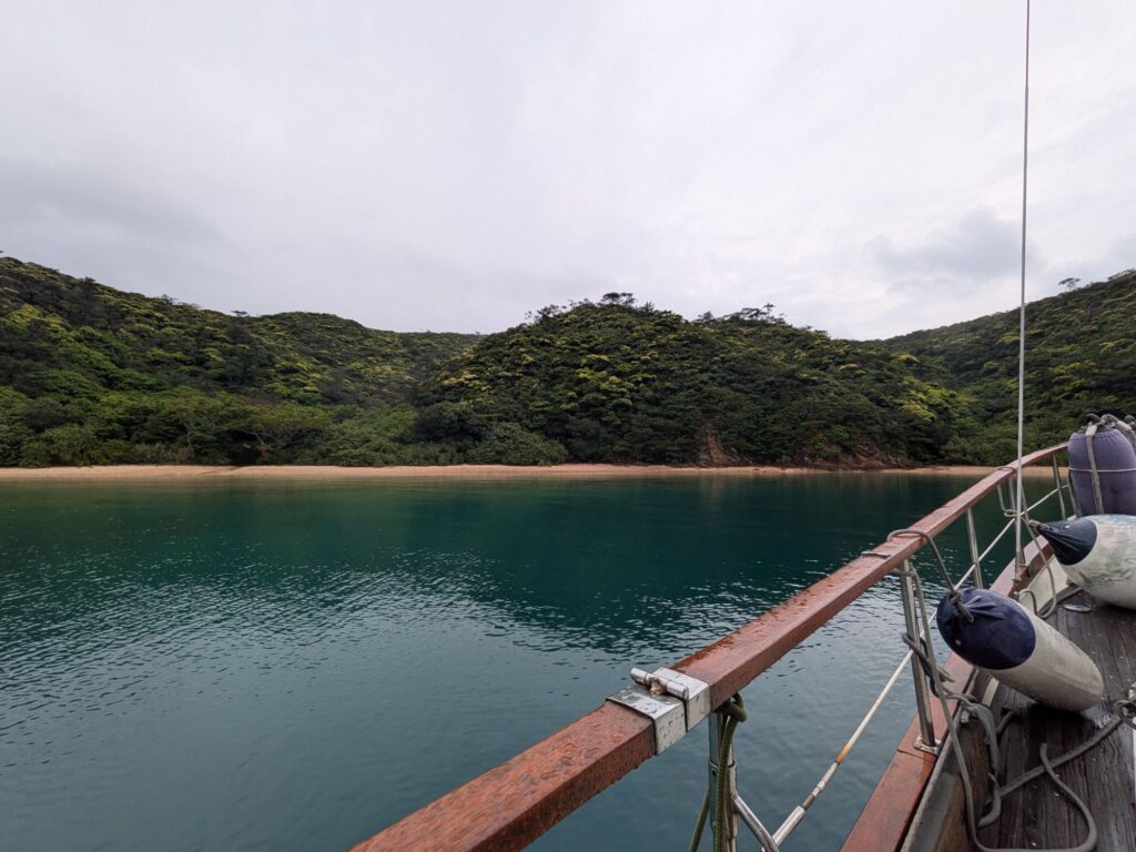 Yacht奄美大島7日目、入江生活も6日目です。予報通り風が強く雨です。昼頃が風も雨もピークでした、入江で三方山でうねりは無いのですが風で海水が舞い上がるブローが吹き荒れていました。雨は夕方まで続きました。