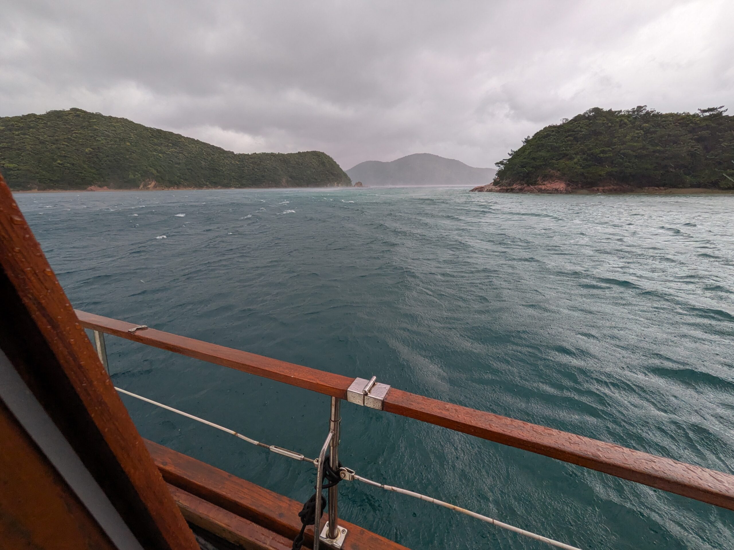Yacht奄美大島7日目、入江生活も6日目です。予報通り風が強く雨です。昼頃が風も雨もピークでした、入江で三方山でうねりは無いのですが風で海水が舞い上がるブローが吹き荒れていました。雨は夕方まで続きました。
