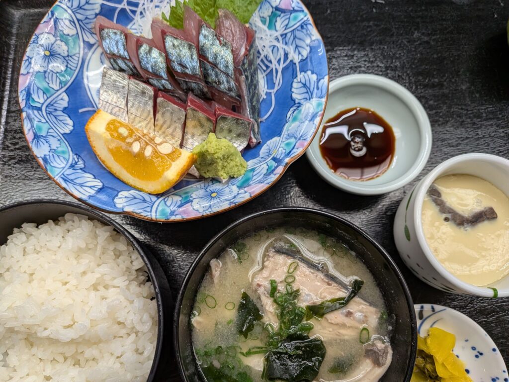 お昼は今日も潮騒。昨日は入荷無かった首折れ鯖の刺身定食をいただきました。