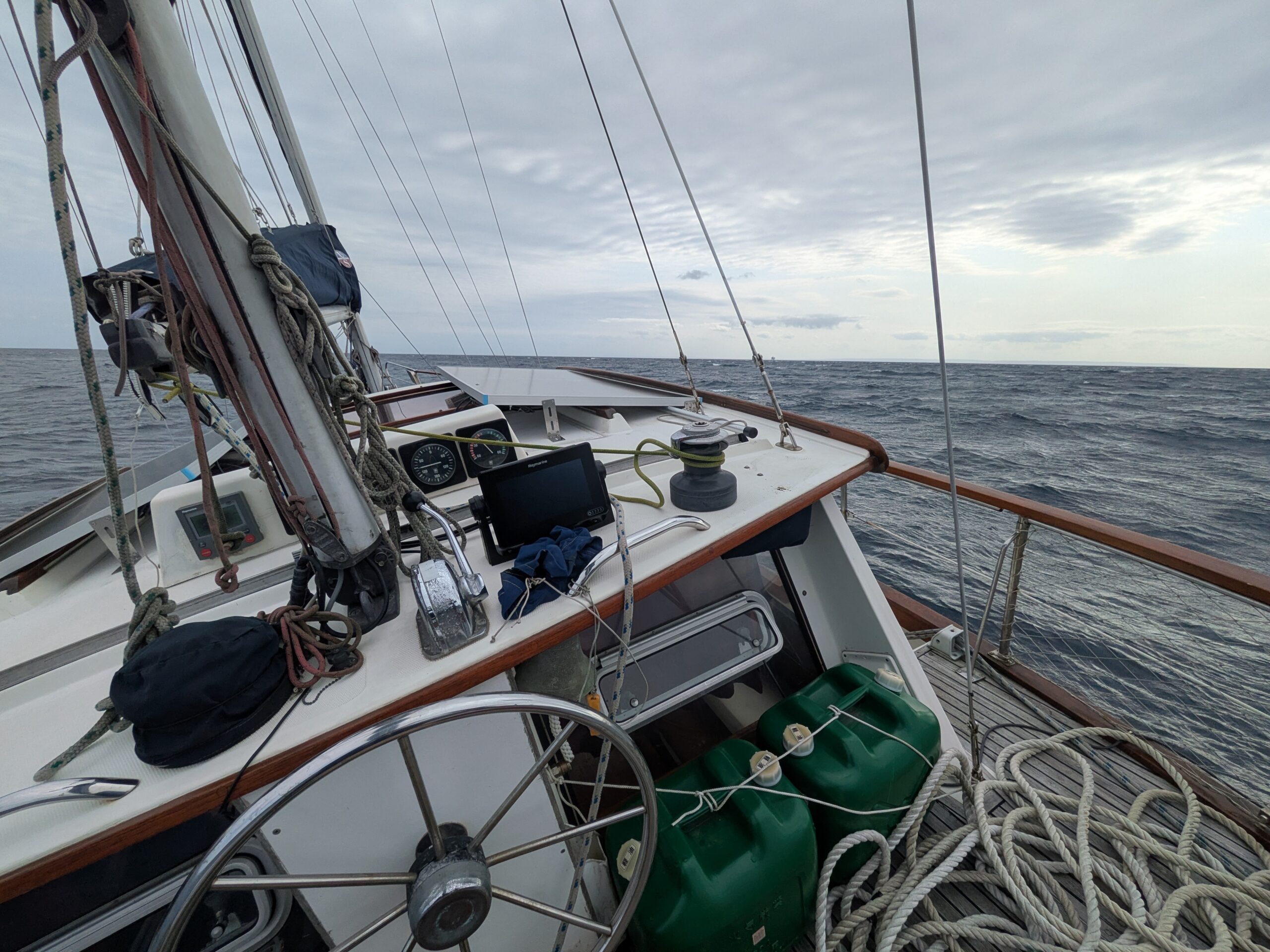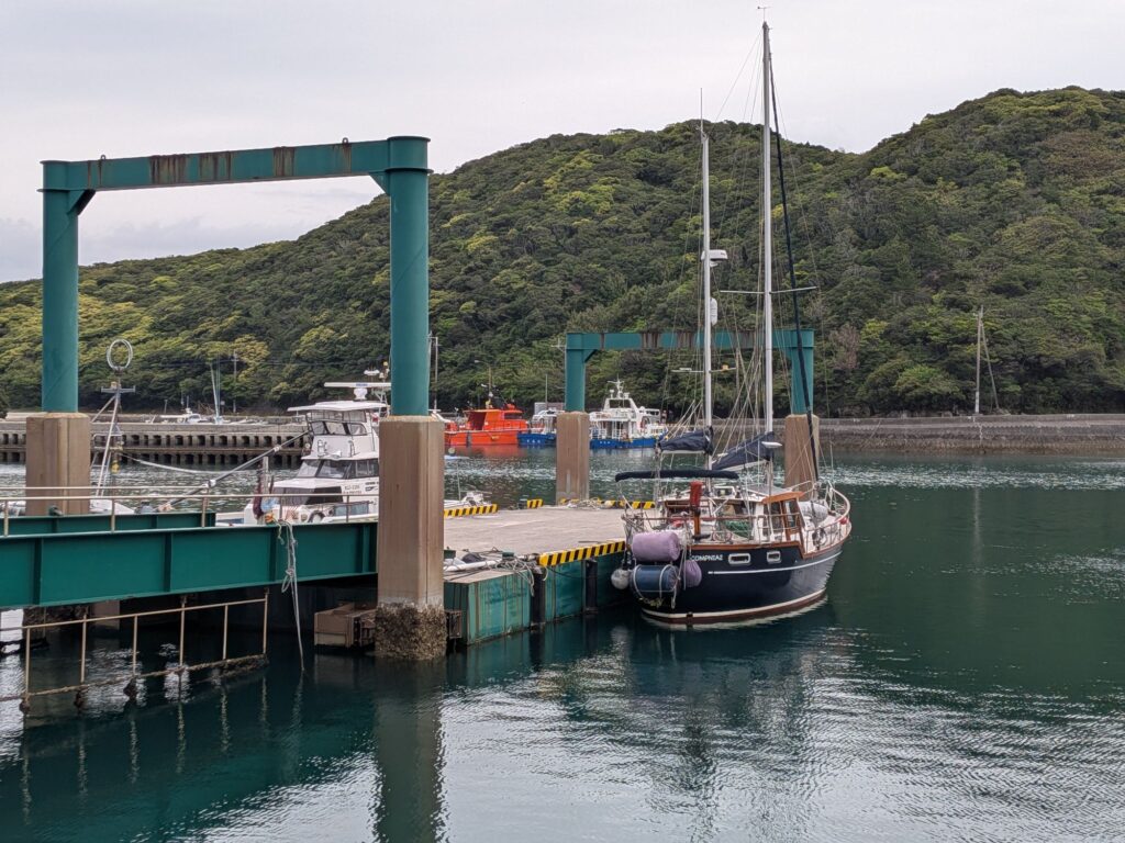 2026/04/09 浦田漁港 Yacht 2026.04.09 南風が強い予報でしたが、郷ノ浦港を9:00に出航。港を出たとたんに波と強風(10〜15m/s)、27海里を5時間かけて種子島の西之表港に着きましたが漁期で漁船が一杯で係留する場所なく、さらに7海里北側の浦田(うらだ)漁港に向かい15:00到着。浮桟橋に係留しました。 港の外は風が強のですが山に囲われ天然の良港、静かです。小さな商店1軒と民宿軒喫茶が1軒、バスもここまでは来ていないようです。明日は荒天予報、ここでのんびりします。