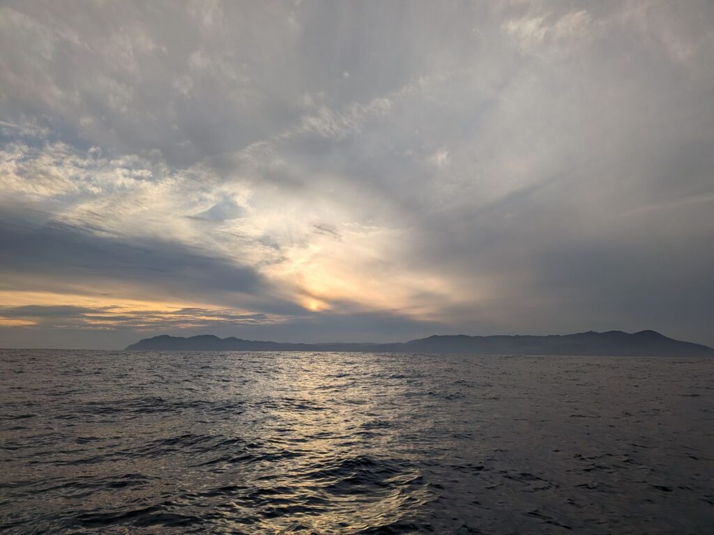 2026/04/11 オーバーナイト Yacht 2026.04.11 浦田漁港を11:30に出航、オーバーナイトで155海里先の大分の佐伯港に向かっています。Windyでは13:00から風が落ちる予想なので風が10m/s吹くなか離岸、1時間半は荒れていましたが予報通り風はおさまりました。うねりはありますが微風連れ潮て快調に走ってます。このまま行けば明日のお昼頃には佐伯港に到着しそうです。宮崎に寄りたかったのですが今日明日を逃せば日向灘は暫く厳しくなりそうなんで苦渋の判断です。 都井岬に沈む夕日です。