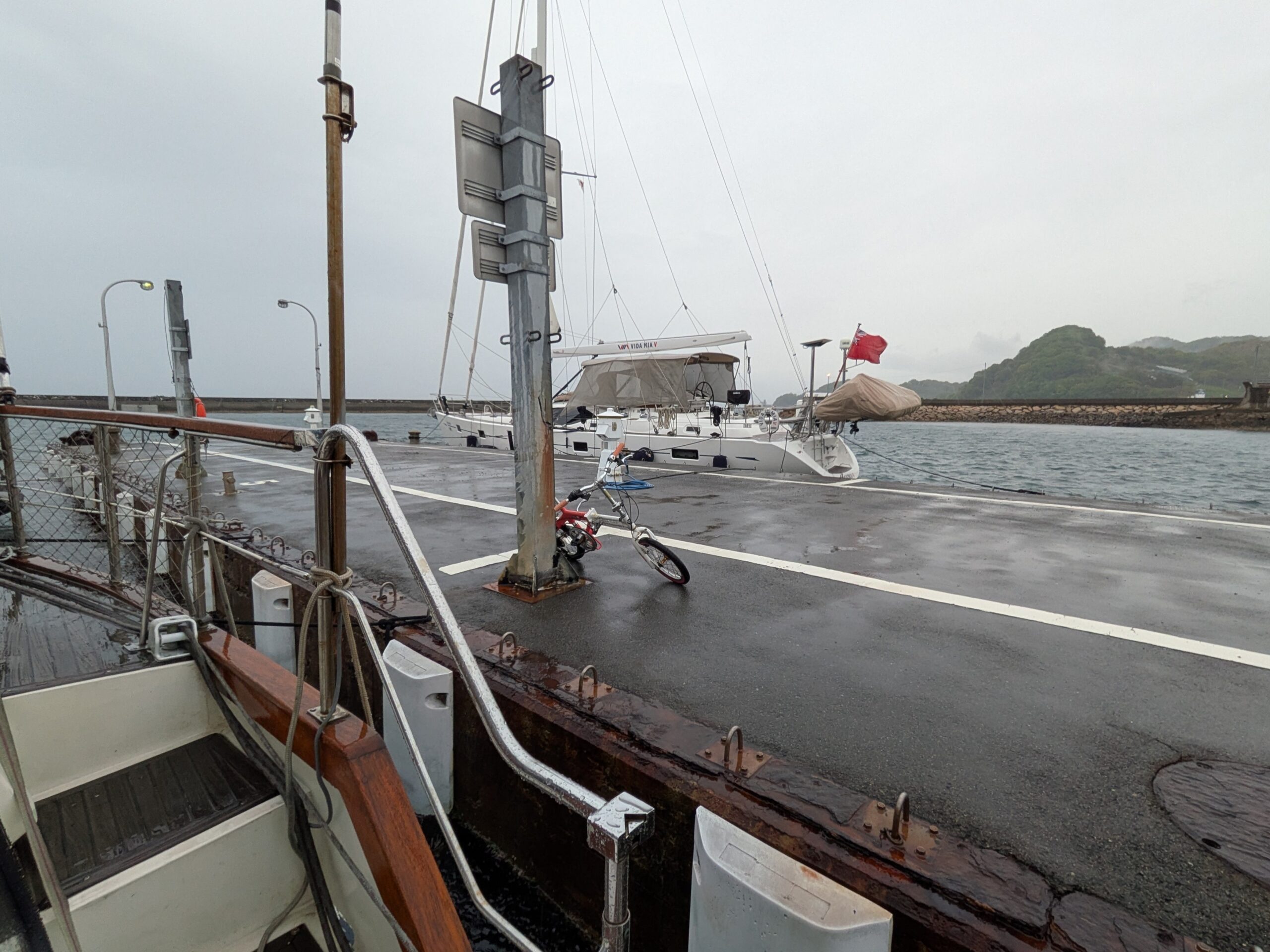 2026/04/23 まつやま・ほりえ海の駅(2) Yacht 2026.04.23 荒天で連泊。四国南岸を低気圧が通過で朝から雨で北東風強く寒く13℃でした、日中もさほど気温は上がらず沖縄帰りにはこたえました。ここは防波堤が短く直接波が入るのでよく揺れました。 お昼は桟橋の前のみなと食堂の地鶏の鍋焼きうどんとおいなりでした。優しい味て満足。 一日中風強く冷たい雨でしたが、夕方雨が止んだのでチャリで3km走ってお風呂に行きました。ゆとりあ温泉。石鹸はないけど大きなサウナあり快適、500円でした。