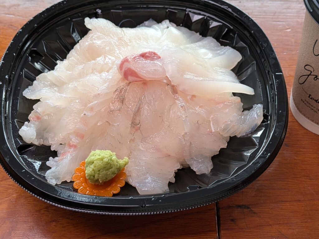 夕飯は魚屋の魚六のヒラメとイカの白い海鮮丼。地味ですがボリューム満点、スープ付き1200円,旨い!